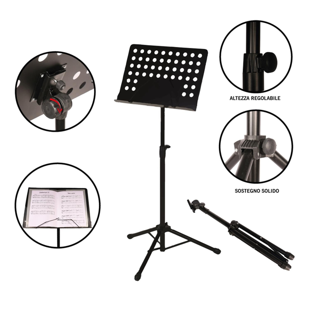 Leggio professionale per orchestra con tavola porta spartiti forata inclinabile e richiudibile, struttura in acciaio regolabile in altezza, verniciato nero.